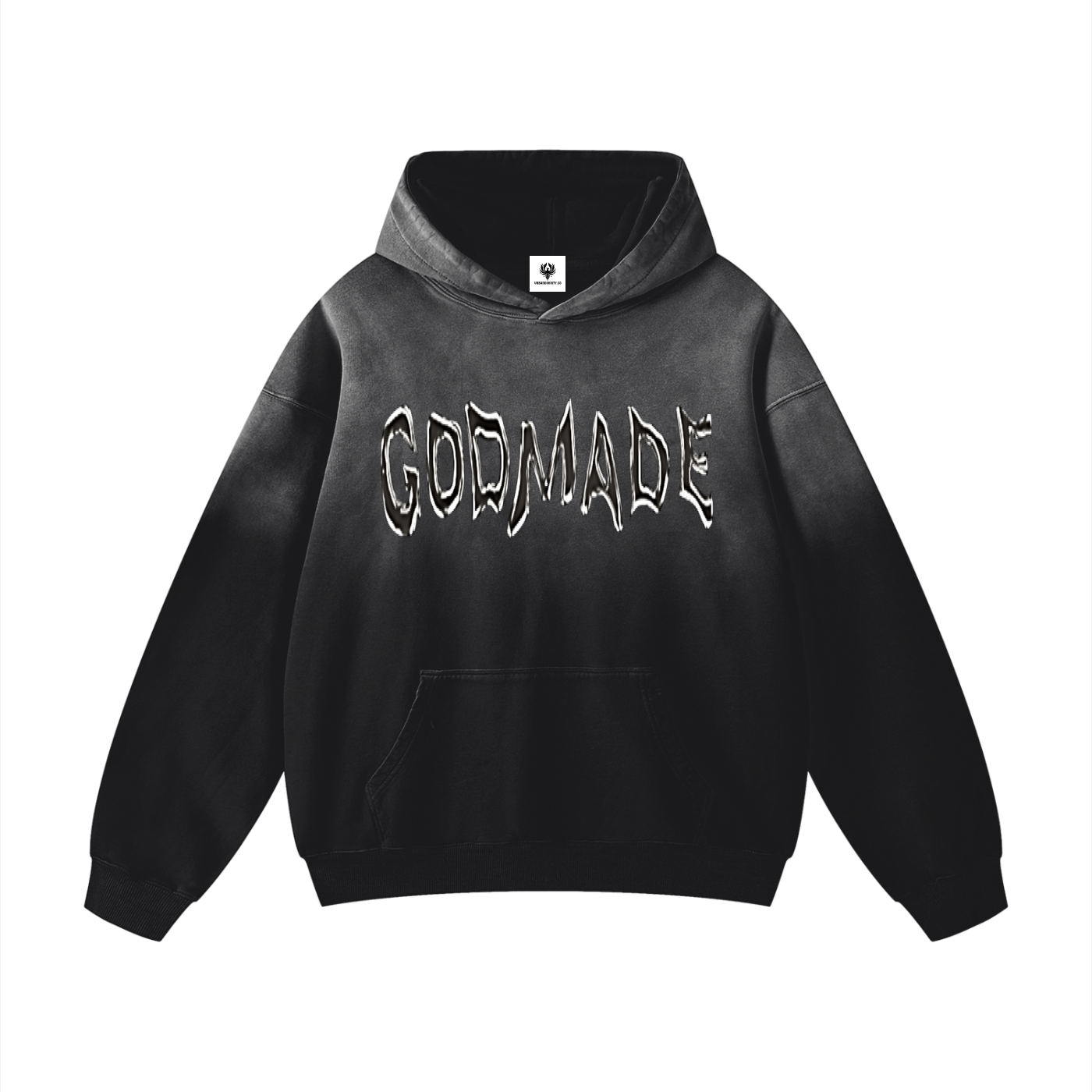 The GodMade Hoodie is a heavyweight 400gsm, 100% cotton hoodie with an oversized, drop-shoulder fit and sun-fade wash. Featuring a bold liquid chrome “GODMADE” design on the front, it combines comfort, durability, and style.
